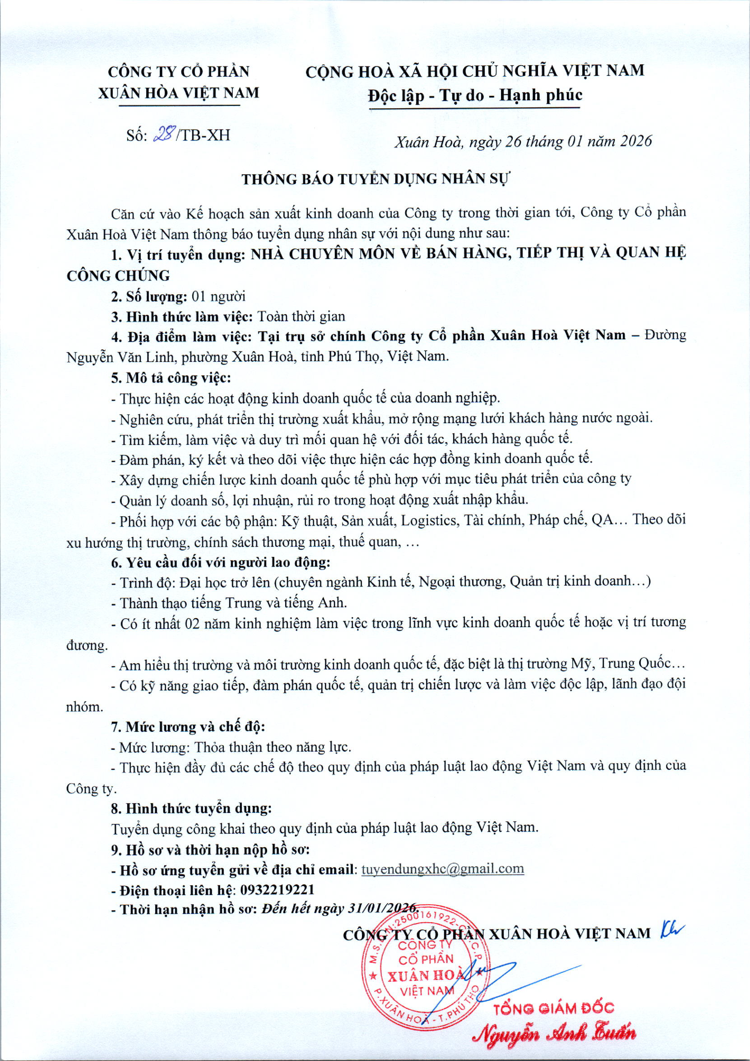 THÔNG BÁO TUYỂN DỤNG NHÂN SỰ